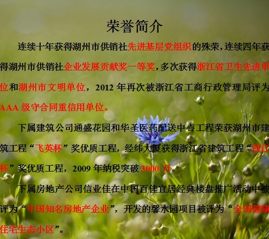| 集團(tuán)一直圍繞著“關(guān)注生命,關(guān)注環(huán)境”的產(chǎn)業(yè)布局方針,做強(qiáng)做大以房地產(chǎn)為龍頭,建筑、裝飾、新型材料、貿(mào)易、為輔助產(chǎn)業(yè)的建筑產(chǎn)業(yè)鏈;做精做活以制藥、化工為重要產(chǎn)業(yè)布局的新興產(chǎn)業(yè)鏈。公司連續(xù)多年被評(píng)為浙江省重合同守信用單位,連續(xù)13年被評(píng)為湖州市供銷社本級(jí)企業(yè)發(fā)展貢獻(xiàn)獎(jiǎng)一等獎(jiǎng),并多次獲得浙江省優(yōu)秀民營(yíng)企業(yè),全省供銷社50強(qiáng)企業(yè),供銷社系統(tǒng)先進(jìn)基層黨組織等榮譽(yù)稱號(hào)。 |